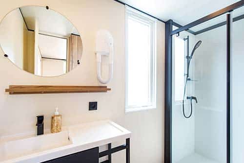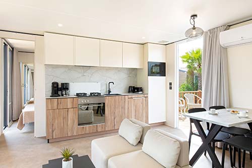This premium mobile home for up to 6 guests stands out with its modern design, exceptional brightness and luxury amenities worthy of a high-end hotel — all set in the stunning natural surroundings of the Esterel mountains.